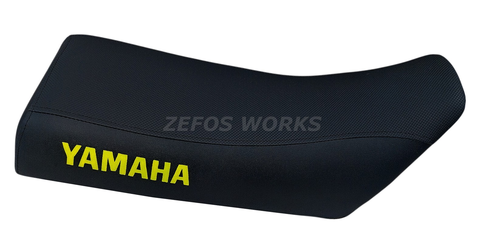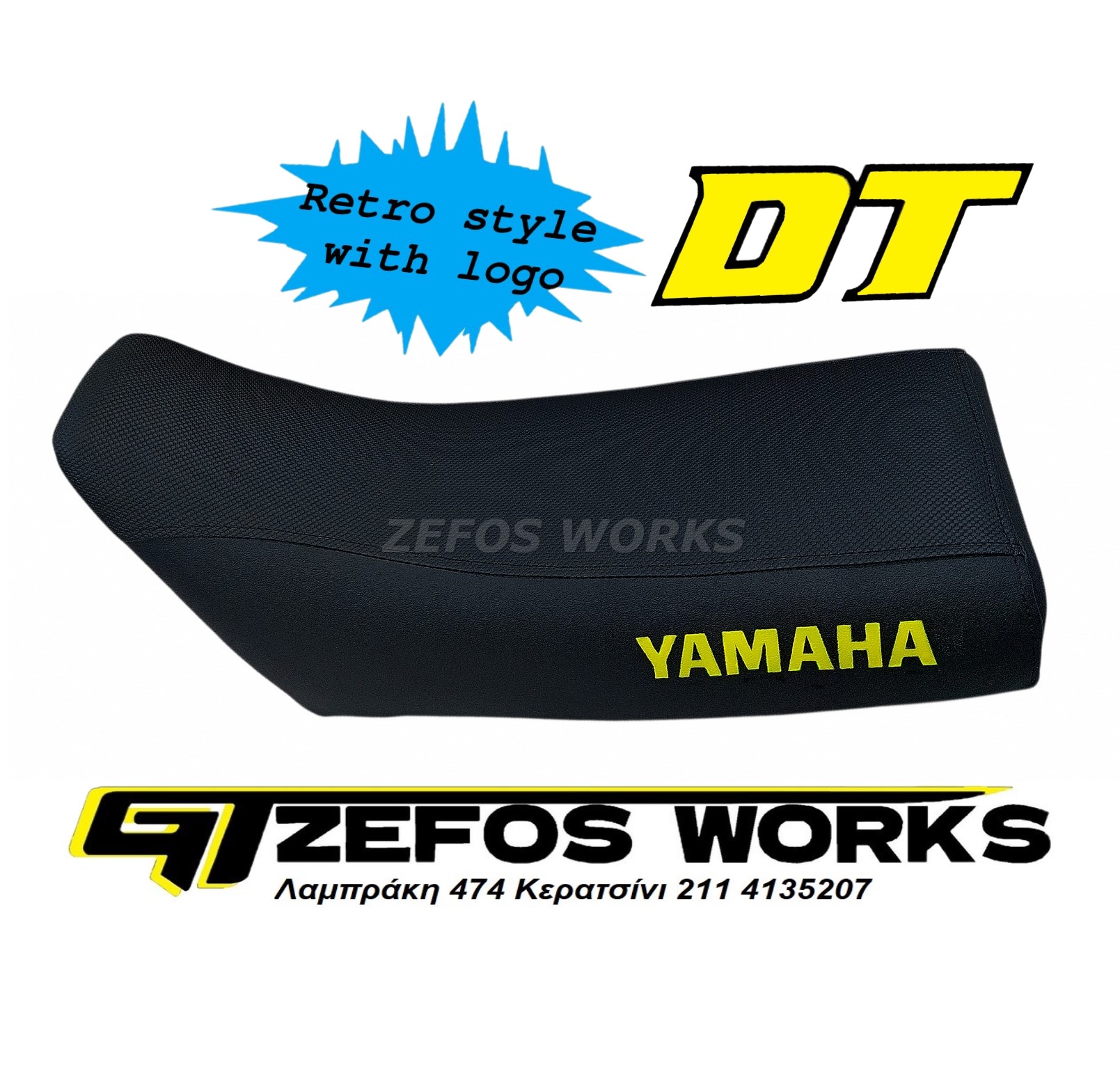 Μαύρη ταπετσαρία με αντιολίσθηση στο πάνω μερος και κίτρινα ”σταμπωτά” λογότυπα για την σέλα του yamaha DT 50cc , υπάρχει δυνατότητα μονοκόμματου καλύμματος οπως ήταν το εργοστασιακό της εποχής.