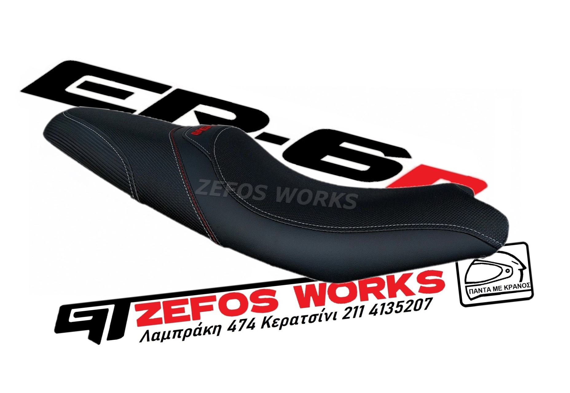 Αντιολισθητική ταπετσαρία δικής μας σχεδίασης με λογότυπο και βελτίωση αφρώδους υλικου για την σέλα του kawasaki ER-6n . Πολλές επιλογές σε υλικά και χρωματισμούς επικοινωνήστε για ραντεβού.