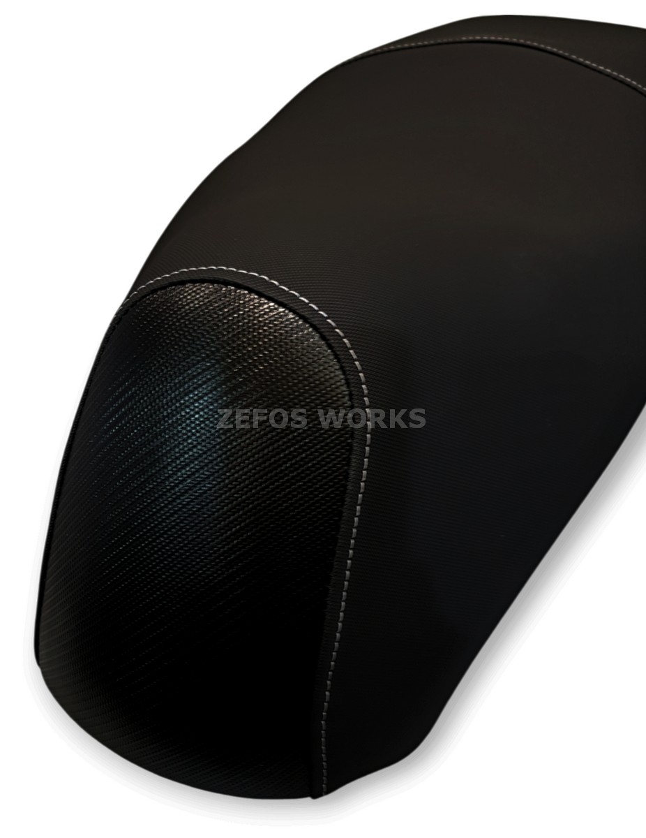 Τα υλικά που έχουν χρησιμοποιηθεί είναι: αντιολισθητικό σε αναβάτη και συνεπιβάτη, περιμετρικά carbon look εξαιρετικής ποιότητας. Οι ραφές είναι γκρι marine grade (ναυτιλιακές).