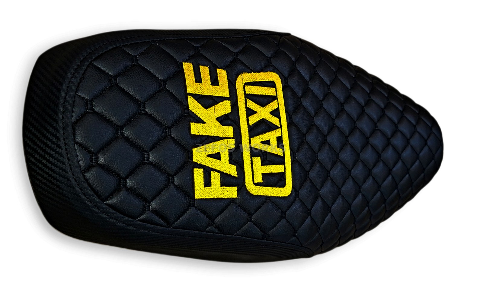 Καπιτονέ- μπακλαβαδωτό κάλυμμα σέλας με μαύρες ραφές και κίτρινο λογότυπο Fake Taxi