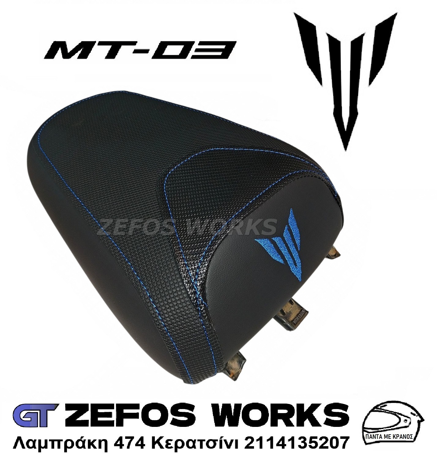 Αντιολισθητικές ταπετσαρίες δικής μας σχεδίασης με μπλε ραφές και λογότυπο με βελτιωμένο αφρώδες υλικό για αυξημένη ανεση για τις σέλες του yamaha MT – 03 (660) , για το συγκεκριμένο μοντέλο διαθέτουμε προσωρινές σέλες αντικαταστασης (ισχύει μόνο για αττική) , ενημερωθείτε για ραντεβού και διαθεσιμότητα.